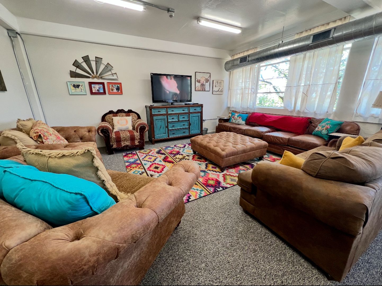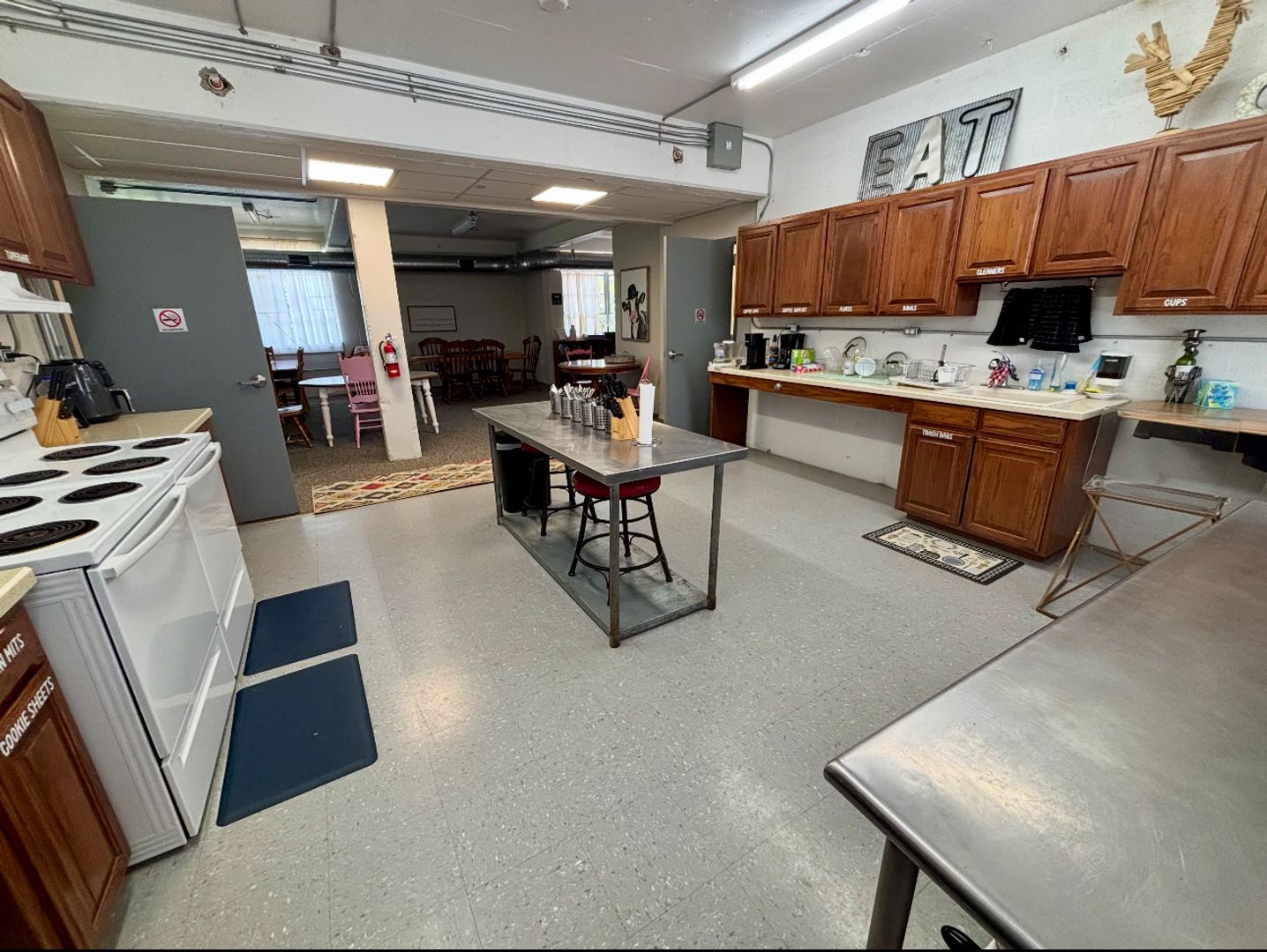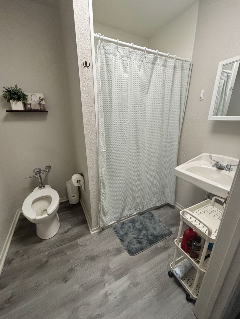 Dormitory-style living with a shared bathroom, a community kitchen and living area, plus a shared laundry room and patio.